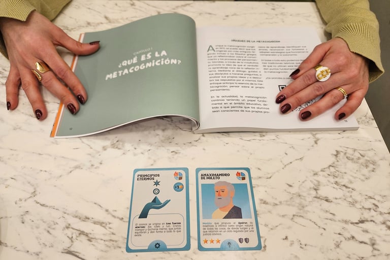 El modelado (Pensar en voz alta): durante las primeras partidas, el adulto debe ser un modelo a imitar. Por ejemplo, podemos decir en voz alta "Voy a usar a Tales de Mileto (Corriente Elemental) y a poner esta carta de Sistema verde porque sé que me da +2 estrellas". Al hacer esto, estamos reduciendo la ansiedad del niño ante lo desconocido y ofreciendo un guión mental que él podrá imitar hasta que sea capaz de generar el suyo propio.